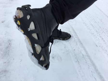 スニーカーで雪のあるところに行く凡ミスをしてしまって、スパイクを使ってみたのでその写真です。